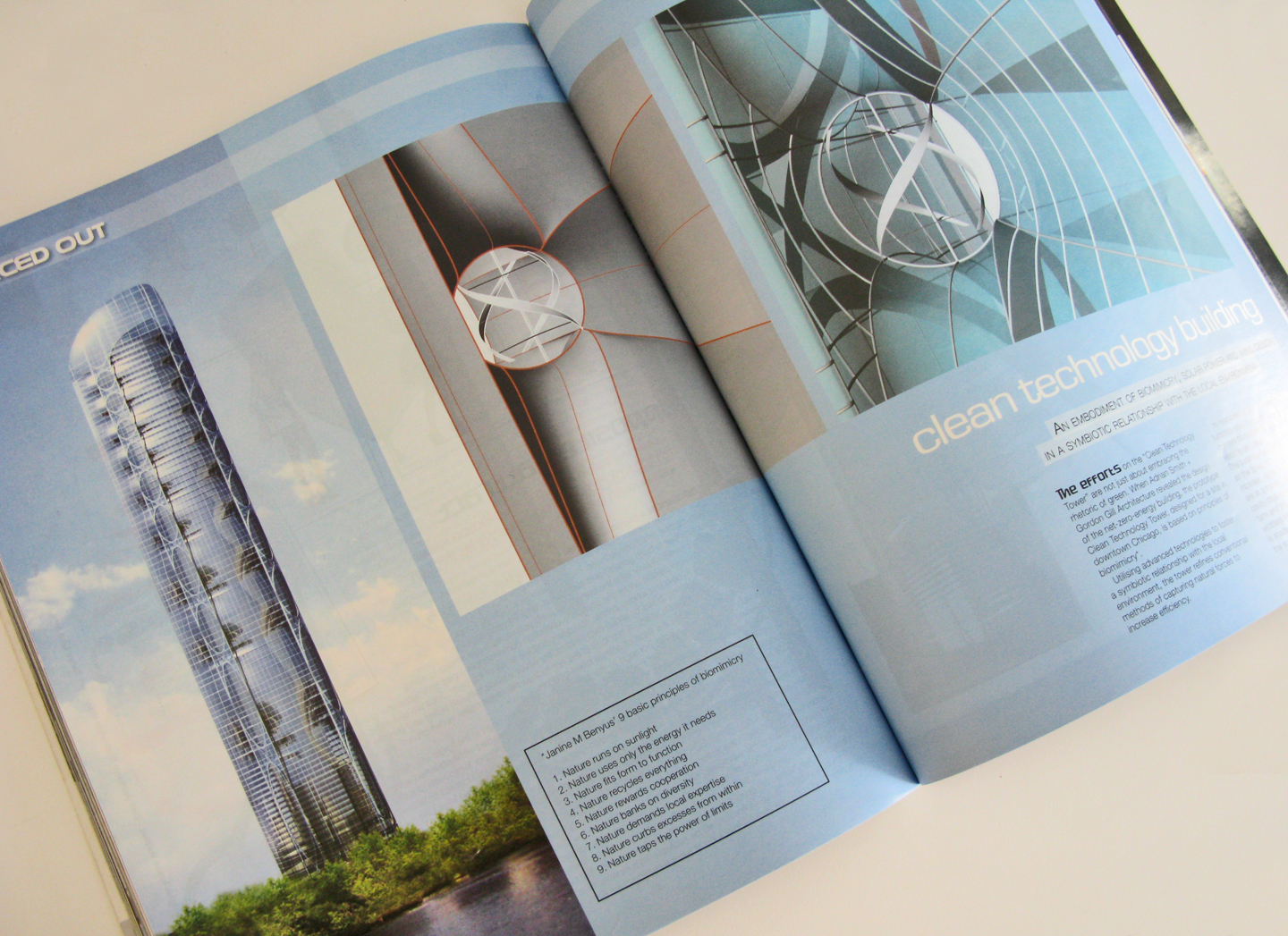 The efforts on the "Clean Technology Tower" are not just about embracing the rhetoric of green. When Adrian Smith + Gordon Gill ARchitecture revealed the design of the net-zero-energy building, the prototype Clean Technology Tower, designed for a site in downtown Chicago, is based on principles of biomimicry.